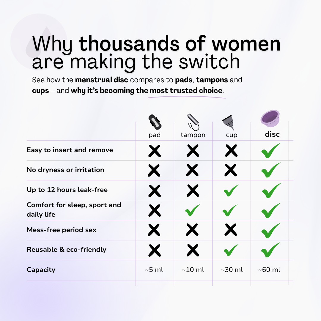Discover how the Menstrual Disc compares to other period products and why it is the trusted choice for comfort, safety and freedom.